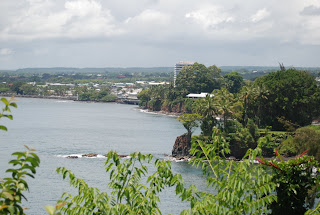 Today was a day to check out our neighbourhood. We drove into Hilo (20 min.) and went on to 3 waterfalls that are all in the same area (pretty much). The first one was called Boiling Pots then Rainbow and finally the highest at 400 feet, Akaka. The last fall was pretty cool. The pathway into it was totally a rainforest with huge ferns and trees and flowers OH AND SMELLS…good smells.